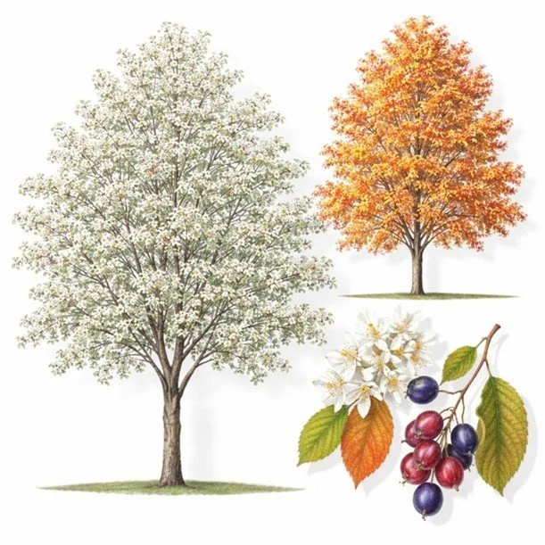 Showy white spring flowers; orange to brilliant red leaves in Autumn