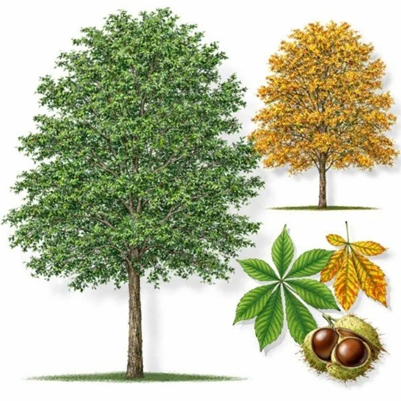 Palmately compound leaves; yellow to orange fall color (often brief)